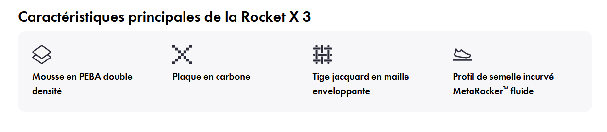 Conçue pour atteindre votre record personnel, la Rocket X 3 est une super chaussure en fibre de carbone qui ne lésine pas sur le maintien. Tout en conservant la même mousse réactive et performante que le modèle précédent, nous avons retravaillé notre plaque en fibre de carbone en y ajoutant de nouvelles ailettes et utilisé une semelle extérieure en caoutchouc adhérent pour que vous puissiez avancer avec assurance quelle que soit la météo. Elle présente une tige en mesh technique monocouche pour une meilleure respirabilité et un bracelet cousu et retourné pour éviter les ampoules, et nous avons supprimé le soufflet pour faciliter l’enfilage.
