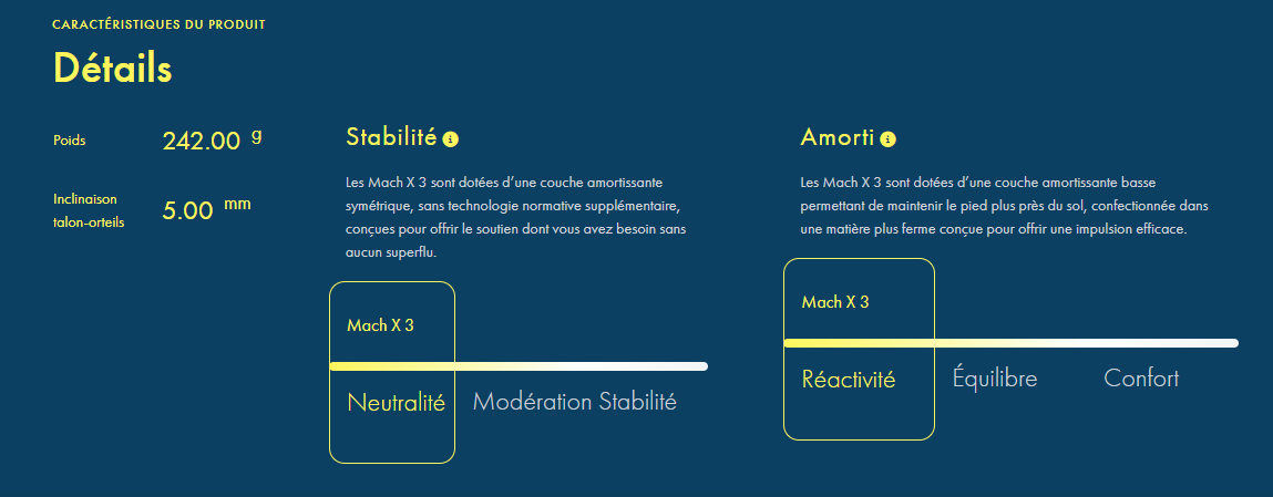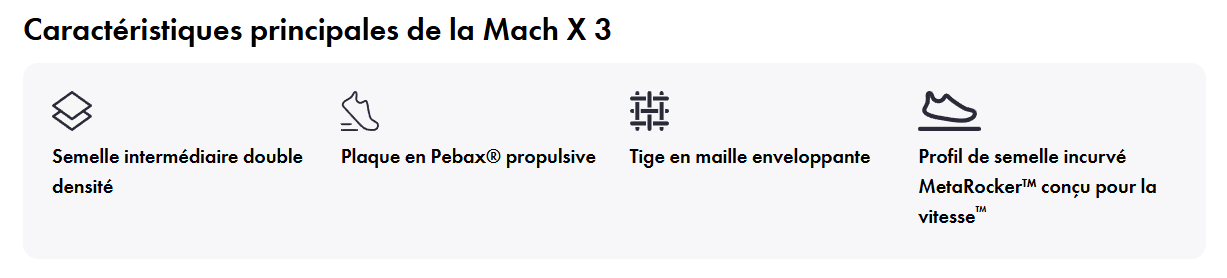 Qui n’a jamais rêvé de franchir le mur du son ? Toute notre réflexion est partie de là. Chaussure d’entraînement dotée d’une plaque qui enflamme vos sessions de vitesse, notre Mach X 3 est le complément idéal de votre arsenal de running. Conçue pour les runs intenses grâce à sa plaque dynamique en Pebax® et à sa semelle intermédiaire ultrarésiliente dotée d’une couche supérieure en PEBA, cette chaussure, désormais équipée d’une tige tissée respirante et d’un bracelet affiné, apporte légèreté, fraîcheur et vitesse à tous vos entraînements.